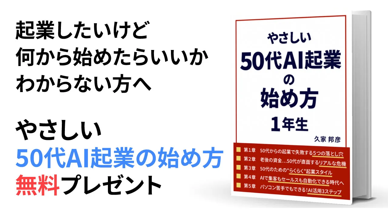 それは書籍『らくらく50代AI起業の教科書』を【無料】で手にいれる道です。